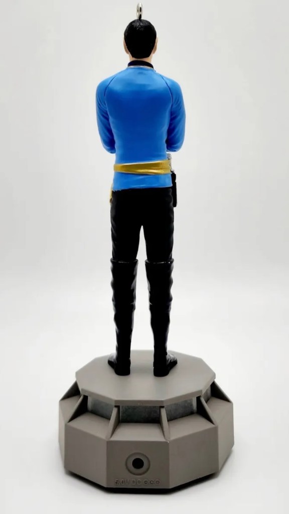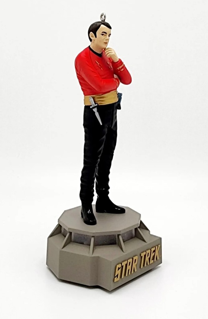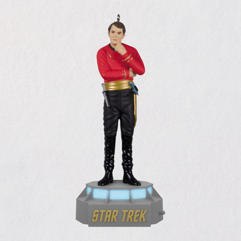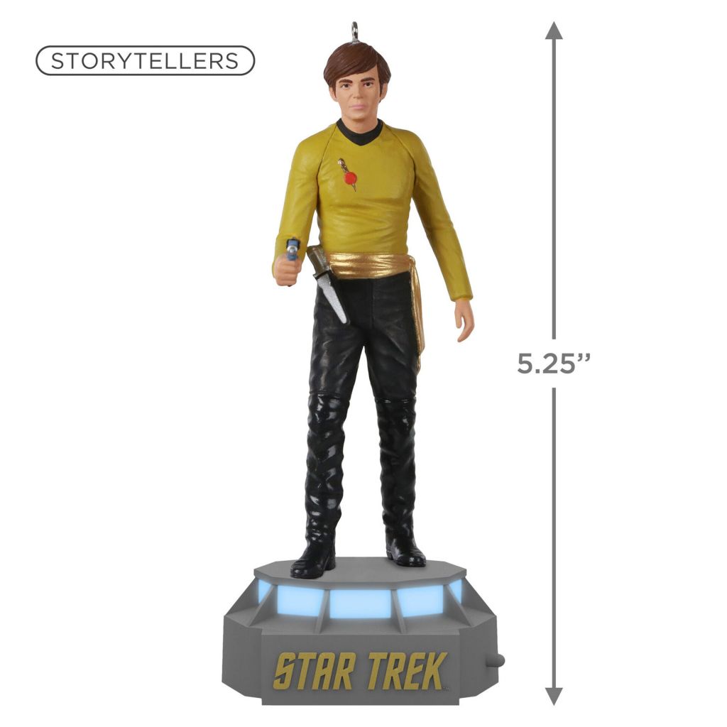 Although tasked with navigational duties on the bridge of the I.S.S. Enterprise, Ensign Chekov of the Terran Empire spent much of his time focused on mutinous thoughts of seizing the captain’s chair for himself. Plug the ornament into Hallmark’s Keepsake Power Cord (sold separately) for constant illumination, then press the button to start a sound and light show based on the classic original Star Trek series episode “Mirror, Mirror.” Connect all of the Star Trek Storytellers ornaments—Captain James T. Kirk, Lieutenant Hikaru Sulu, Lieutenant Nyota Uhura, First Officer Spock and Ensign Pavel Chekov—and the U.S.S. Enterprise Tree Topper (each sold separately) to unlock additional interactive performances.