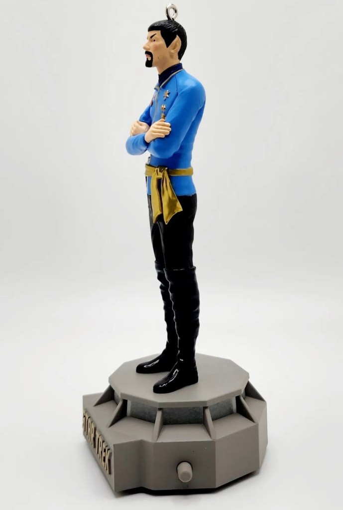 A striking departure from his prime-universe self, Spock’s discipline toward logic and science not only made him an inscrutable presence aboard the I.S.S. Enterprise but also led him to discern Captain Kirk’s most dangerous secret. Plug the ornament into Hallmark’s Keepsake Power Cord (sold separately) for constant illumination, then press the button to start a sound and light show based on the classic original Star Trek series episode “Mirror, Mirror.” Connect all of the Star Trek Storytellers ornaments—Captain James T. Kirk, Lieutenant Hikaru Sulu, Lieutenant Nyota Uhura, First Officer Spock and Ensign Pavel Chekov—and the U.S.S. Enterprise Tree Topper (each sold separately) to unlock additional interactive performances.