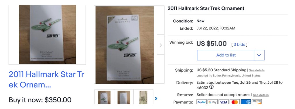A 2011 Defiant ornament went up for auction in July that had a few red flags. The seven day auction was originally launched with a $350 “Buy it now” option. In less than 9 hours it had received three bids before it was listed as sold, six days prematurely, for $51. It seems the ornament was relisted on eBay by the original seller and sold for $299.