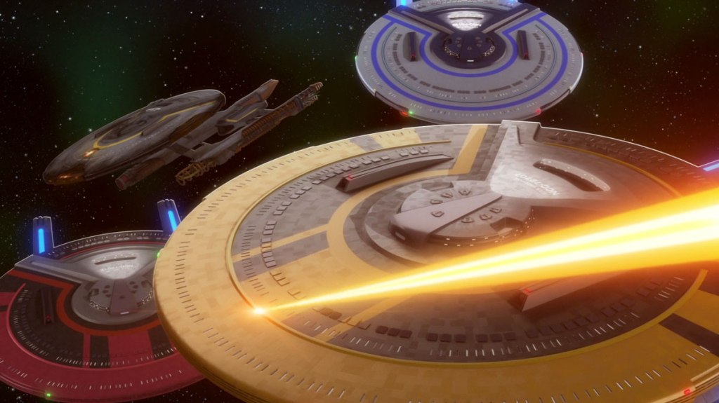 We’ve extended the visual metaphor of the uniforms to the ships, and the Cerritos has yellow on the hull because it’s primarily a second contact engineering ship. They show up to planets that need engineering stuff done on them in order to be able to communicate with the Federation.