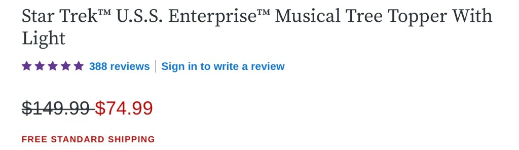 Hallmark.com has the entire Star Trek Storytellers line up available at half price. It is a great opportunity to pick up anything missing from your collection including a much more affordable Enterprise Tree Topper.