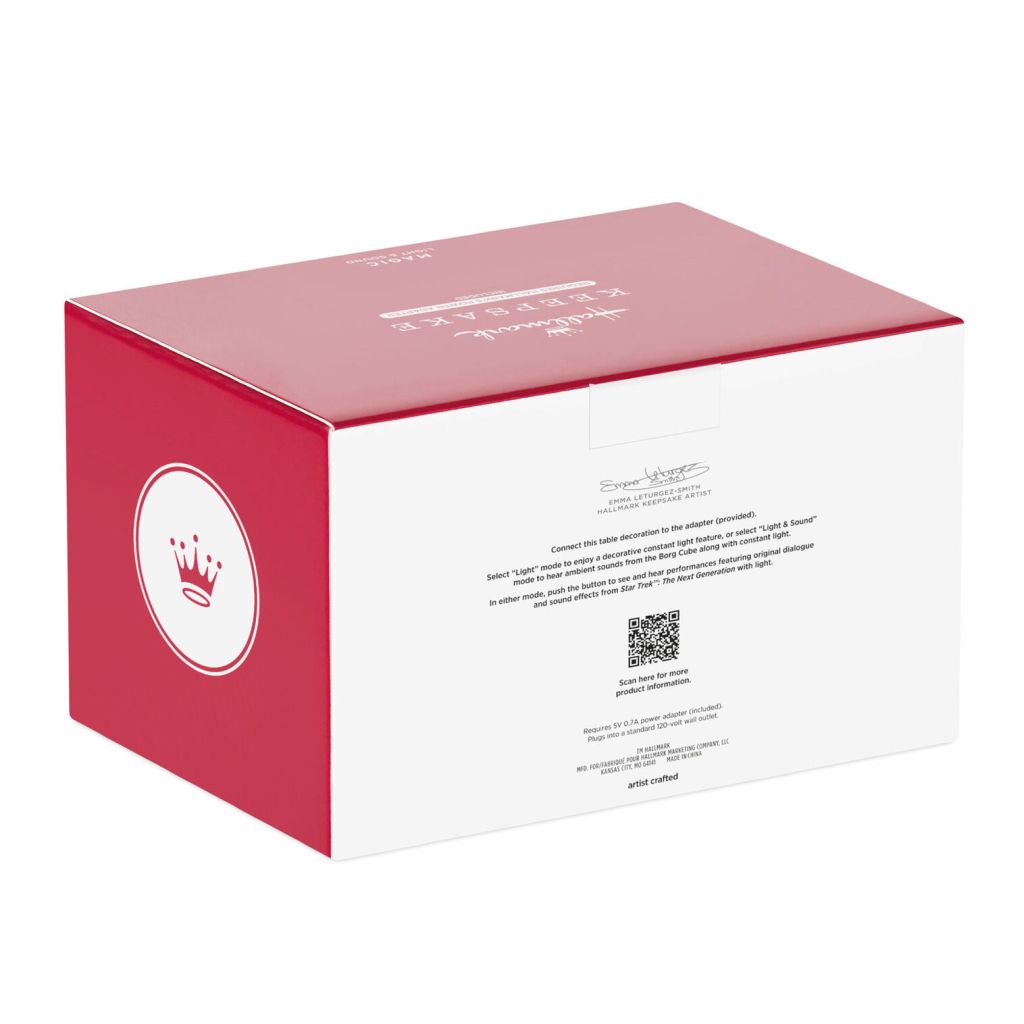 Bring the 24th century to your Christmas celebrations with this dynamic tabletop decoration. Relive the mystery and adventure as the crew of the U.S.S. Enterprise-D faced its most fearsome enemy—a cube vessel of the Borg Collective—in “Star Trek: The Next Generation.” Connect to the included power adapter for a continuous light effect, or a continuous light and sound experience. Press the button to see the Borg cube come to life with a synchronized light and sound performance from the fan-favorite episode “The Best of Both Worlds: Part 1.”