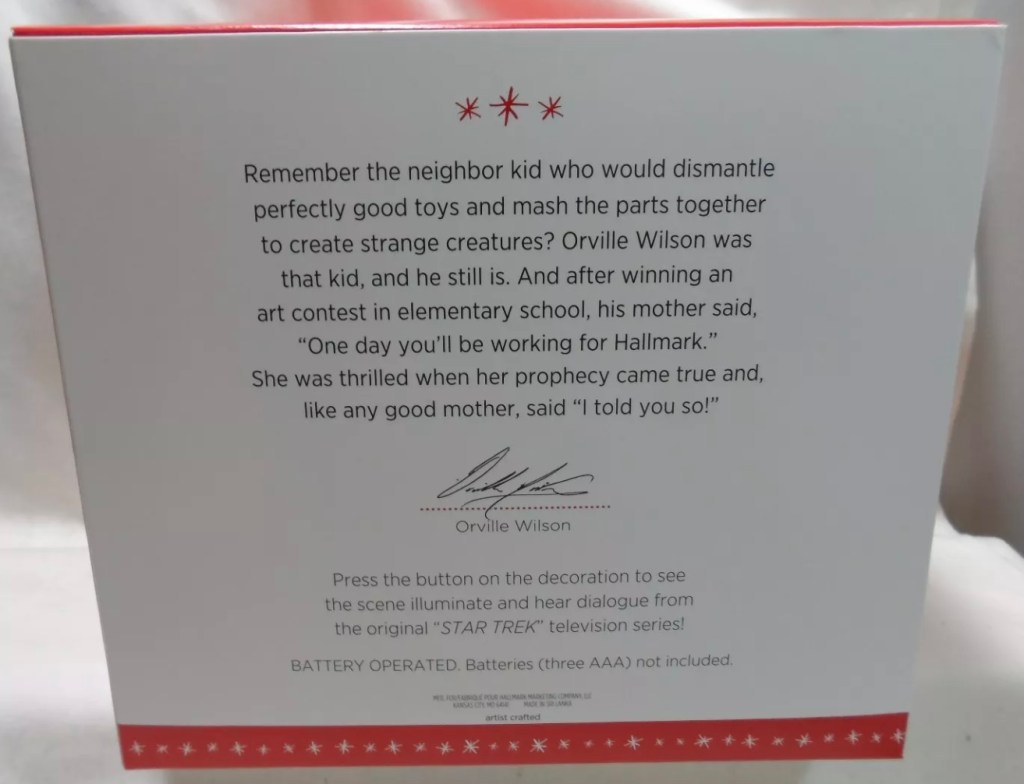 Tabletop decoration. Hallmark Gold Crown Exclusive. Magic Light and Sound. Press button to see scene illuminate and hear dialogue from original STAR TREK TV series. On decoration: STAR 50 TREK™ Dated 2016. Artist: Orville Wilson Battery operated. Batteries Included. Pre-packaged for easy gift giving, preservation and storage. 7.4″ W x 5.7″ H x 4.6″ D