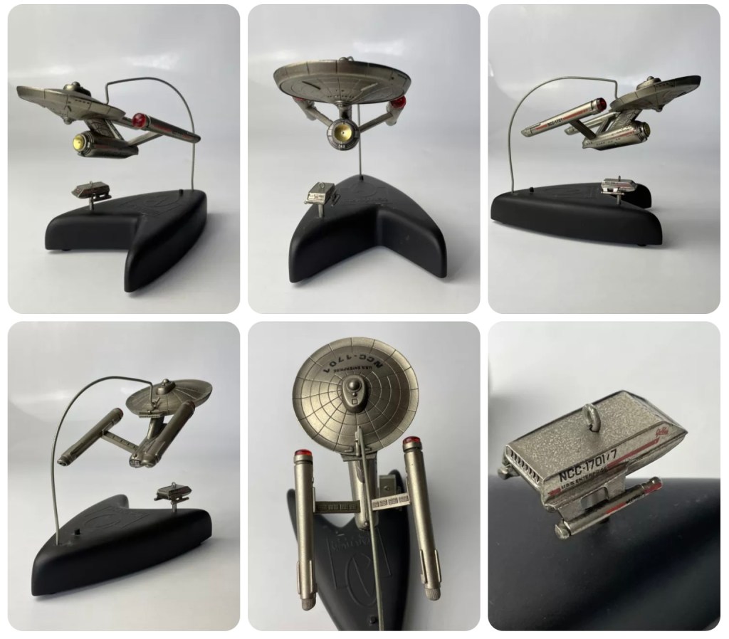 “Space… the Final Frontier. These are the voyages of the Starship Enterprise. Its five-year mission: To explore strange new worlds… to seek out new life and new civilizations… to boldly go where no man has gone before…”. Size: Enterprise: 5 1/4″ L x 2 1/2″ W x 2″ H, Shuttlecraft: 1″ L x 1/2″ H, Base Display: 5 1/2″ L