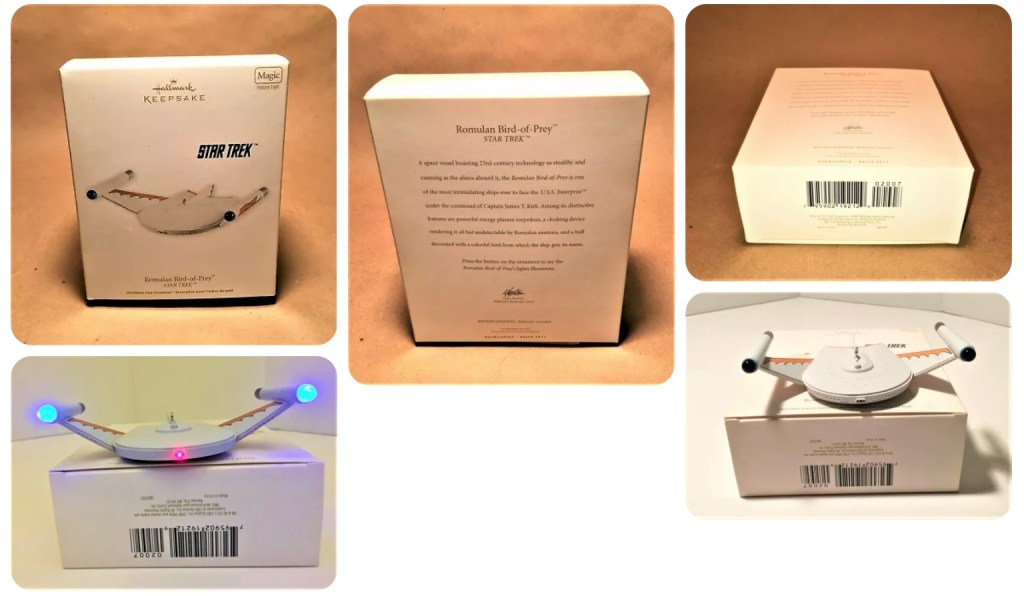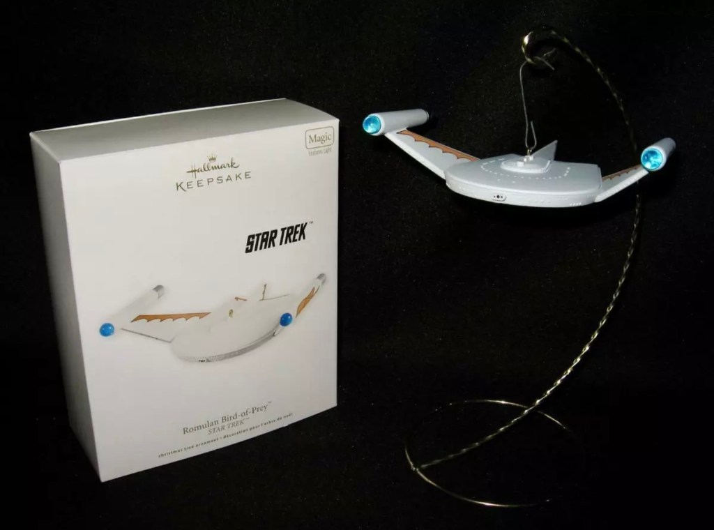 Press the button on the ornament to see the Romulan Bird-of-Prey’s lights illuminate.