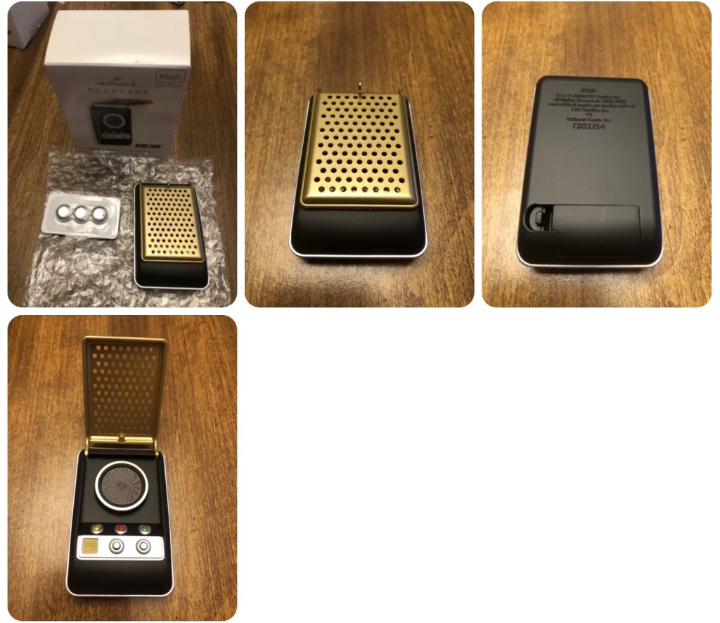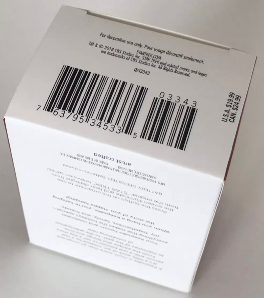 Press the button on the ornament to see the screen illuminate and hear dialogue from the original “STAR TREK” television series! Battery- operated. Includes three replaceable LR44 batteries.