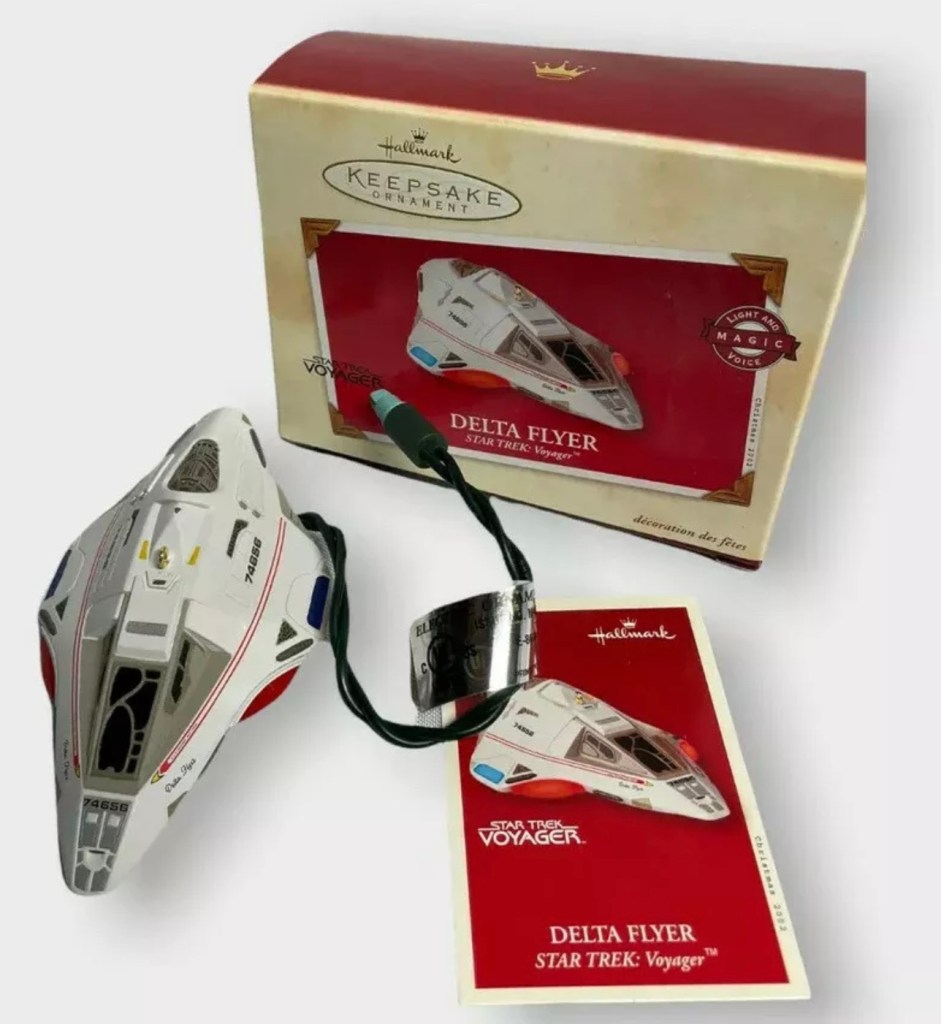 Featuring Light and Voice! A unique ornament! The Delta Flyer was originally intended as a space-faring “hot rod” by a crew member known for his keen interest in 20th-century automobiles. Later, as numerous crew members collaborated on design and construction, their diverse backgrounds were reflected in the technologically advanced shuttlecraft.