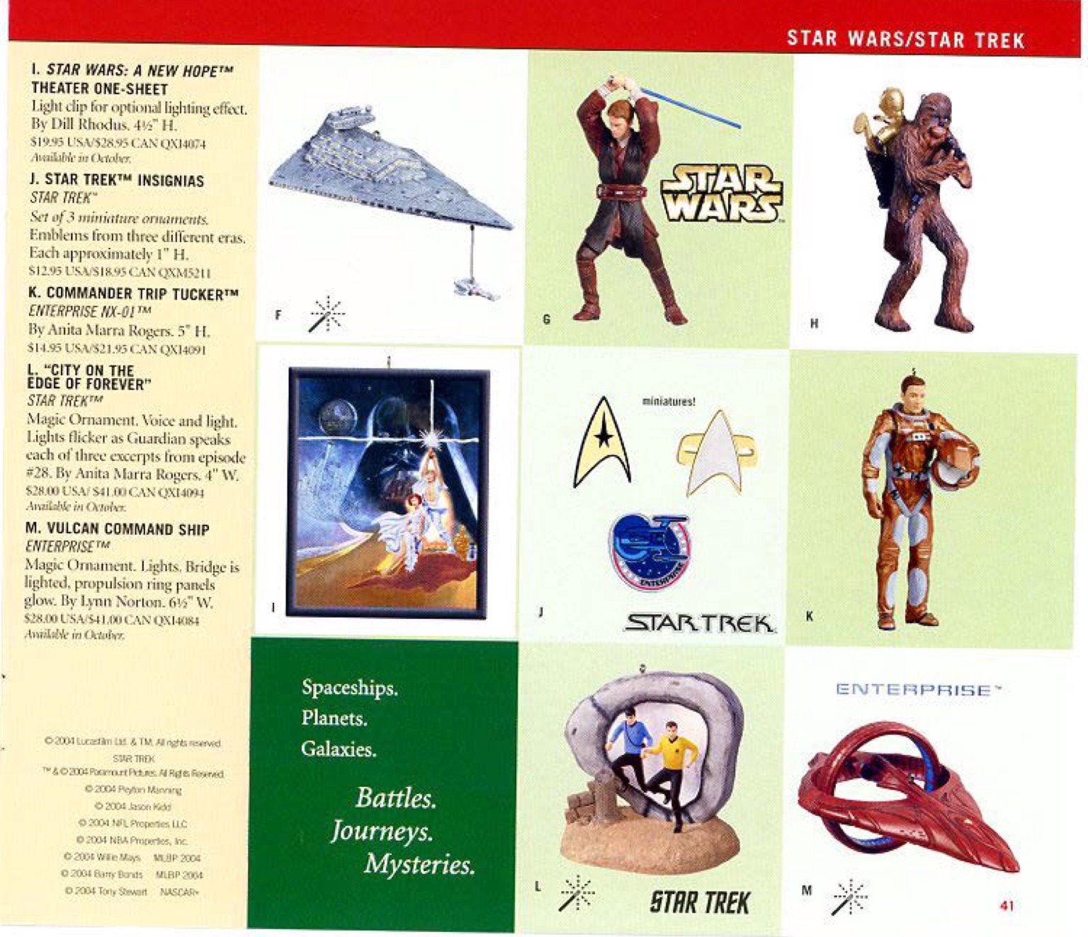 These mini ornaments are reproductions of emblems from three different eras. The Command Insignia from STAR TREK the Original Series, the Communicator from the STAR TREK Movies, STAR TREK: The Next Generation, Deep Space Nine and STAR TREK: Voyager, and the insignia from ENTERPRISE.