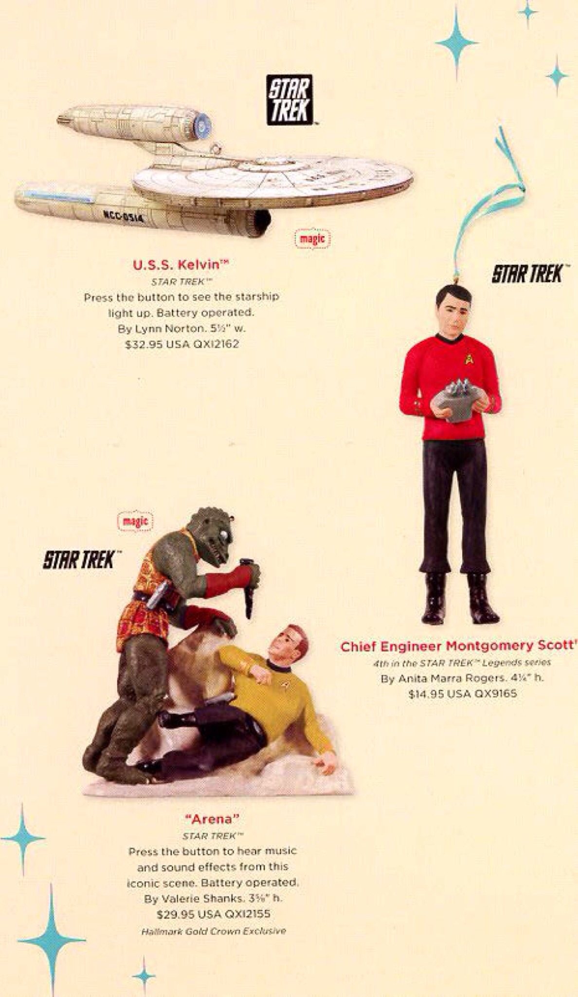 Of all the 23rd-Century technological wonders aboard the U.S.S. Enterprise, none has proven more useful and more captivating than the transporter chamber. Experience the transporting effects of light, sound and motion as first used in the original Star Trek television series with the push of a button. This interactive water globe features Captain Kirk, Mr. Spock and Lieutenant Uhura during a recreation of beam-down and beam-up sequences as featured in the classic science-fiction series. Makes a great gift for fans of the popular Sci-Fi TV series.